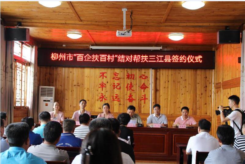 5月13日上午,柳州市“百企扶百村”结对帮扶三江县签约和捐赠仪式在三江县委统战部举行,市委统战部副部长、市工商联党组书记莫朝晖出席并讲话。来自柳江区工商联(总商会)、柳州市客家商会、广西日田药业集团、广西祥兴实业集团、广西宏华生物实业股份公司、广西喜莲娜实业有限公司、柳州桂河房地产开发有限公司、广西雄峰房地产开发有限公司、柳州市威腾汽车配件厂、柳州市双恒物资贸易有限公司等十余家民营企业代表与三江今年预脱贫村进行了集体签约,并捐赠价值共计8.6万元的慰问物资一批。