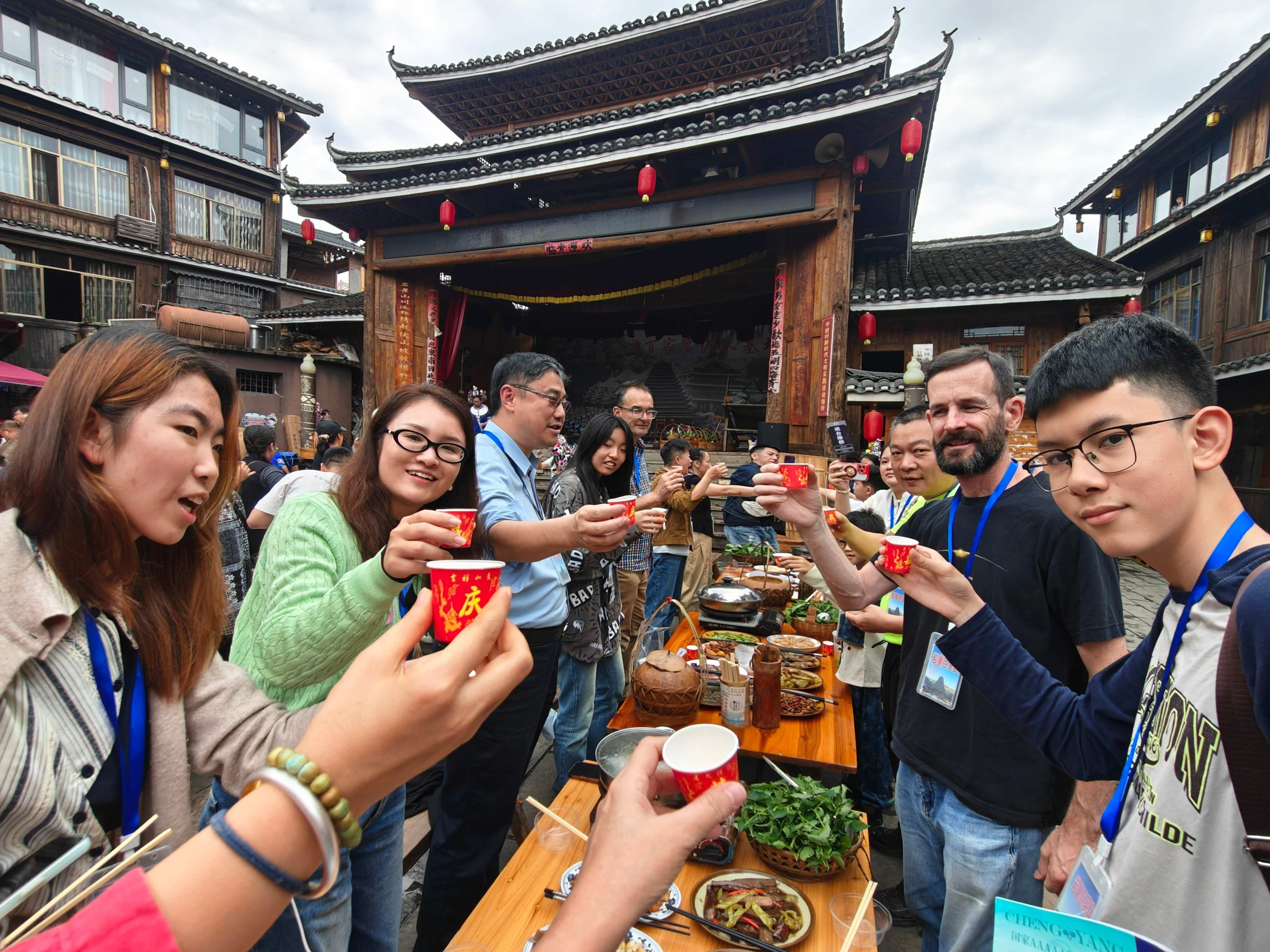 图为交流团在三江侗族自治县品尝长桌宴
