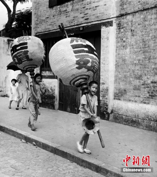 约1955-1965年间,澳门,两个孩子举着印着广告的灯笼。