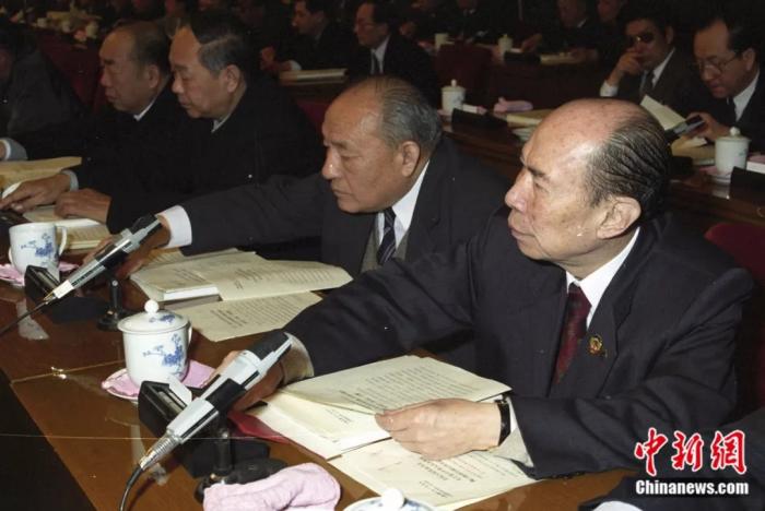 1993年3月,《中华人民共和国澳门特别行政区基本法》获得通过。图为马万祺(右)按表决器。(中新社记者贾国荣摄)