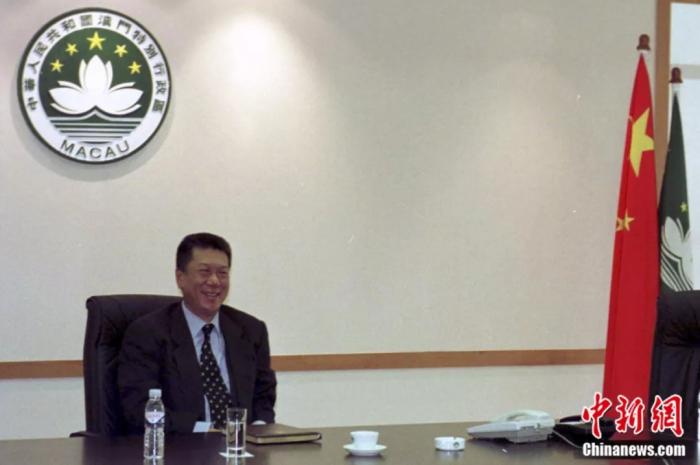 1999年12月23日是澳门回归后的第一个工作日,首日上班的首任行政长官何厚铧笑容满面。(中新社记者毛建军摄)