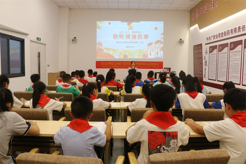 随后,青少年们来到柳州市民族团结进步教育示范基地广西仙草堂制药有限公司,仔细聆听了红领巾巡讲团所作《聆听领袖嘱托——学习二十大 争做好队员》主题宣讲,观看中国十年来发展变化的视频,了解党的二十大报告内容,认清党的二十大召开的重大意义。同时,还参观了仙草堂生态灵芝透明工厂,深入了解灵芝、青蒿素种植生产知识、治疗疾病原理等,最后为新认识的小伙伴写信,分享家乡风俗文化、美景、美食,讲述自己成长趣事。