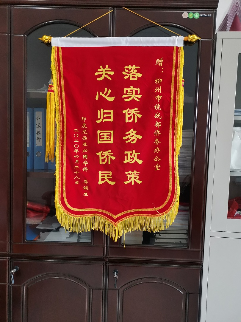 近日,印尼归侨李健生为柳州市委统战部、市侨务办公室送来了一面“落实侨务政策、关心归国侨民”锦旗。